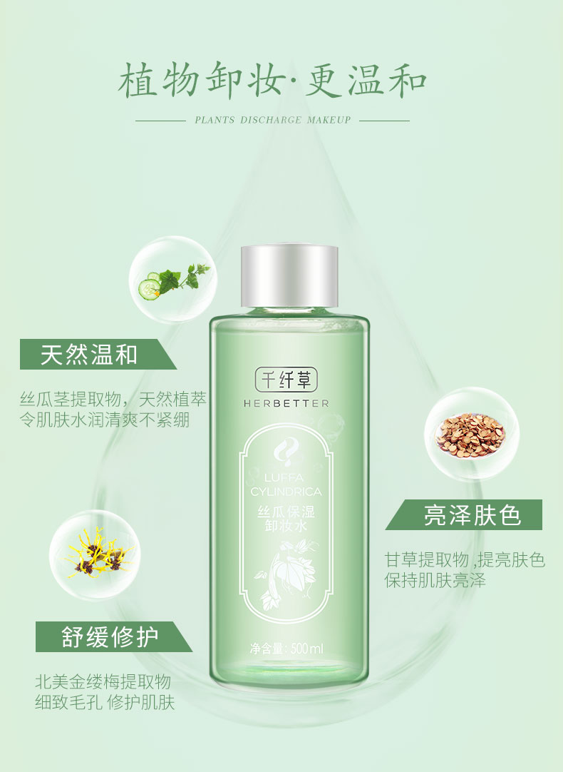 千纤草卸妆水是完美卸妆油,天然植物成分,锁水保湿,温和无刺激,都是丝瓜汁,荆汁液,甘草及玫瑰花提取天然植物成分,PH值接近于眼泪的PH值。无香精无防腐剂无色素,不含矿物油。