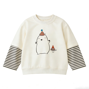 可爱童装假两件男女童卡通印花拼接条纹袖长袖春秋款洋气宽松上衣 优惠券:¥70元
